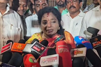 திருவள்ளூர் மாவட்டம் திருத்தணியில் பாஜக முன்னாள் மாவட்ட செயலாளர் எம்.இ. குமரன் இல்ல திருமண விழா நிகழ்ச்சியில் கலந்து கொள்வதற்கு வருகை தந்தார் தெலுங்கானா முன்னாள் ஆளுநர் , தமிழக பாஜக முன்னாள் தலைவர் தம...